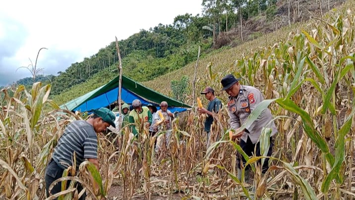 POLRES POLMAN — Kanit Binmas Polsek Matangnga, AIPTU Najamuddin, ikut membantu kegiatan panen jagung bersama Ketua Kelompok Tani Mesakada, Irham, dan para anggota kelompok tani di lahan seluas satu hektar yang terletak di Desa Tapua, Kecamatan Matangnga, Kabupaten Polewali Mandar, Senin (27/10/2025).