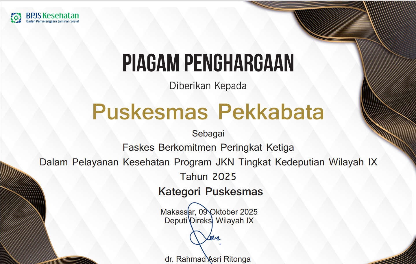 Penghargaan tersebut diserahkan dalam kegiatan yang digelar BPJS Kesehatan di Makassar pada 9 Oktober 2025, sebagai bentuk apresiasi kepada fasilitas kesehatan tingkat pertama yang dinilai konsisten dan berkomitmen dalam mendukung pelaksanaan Program JKN.