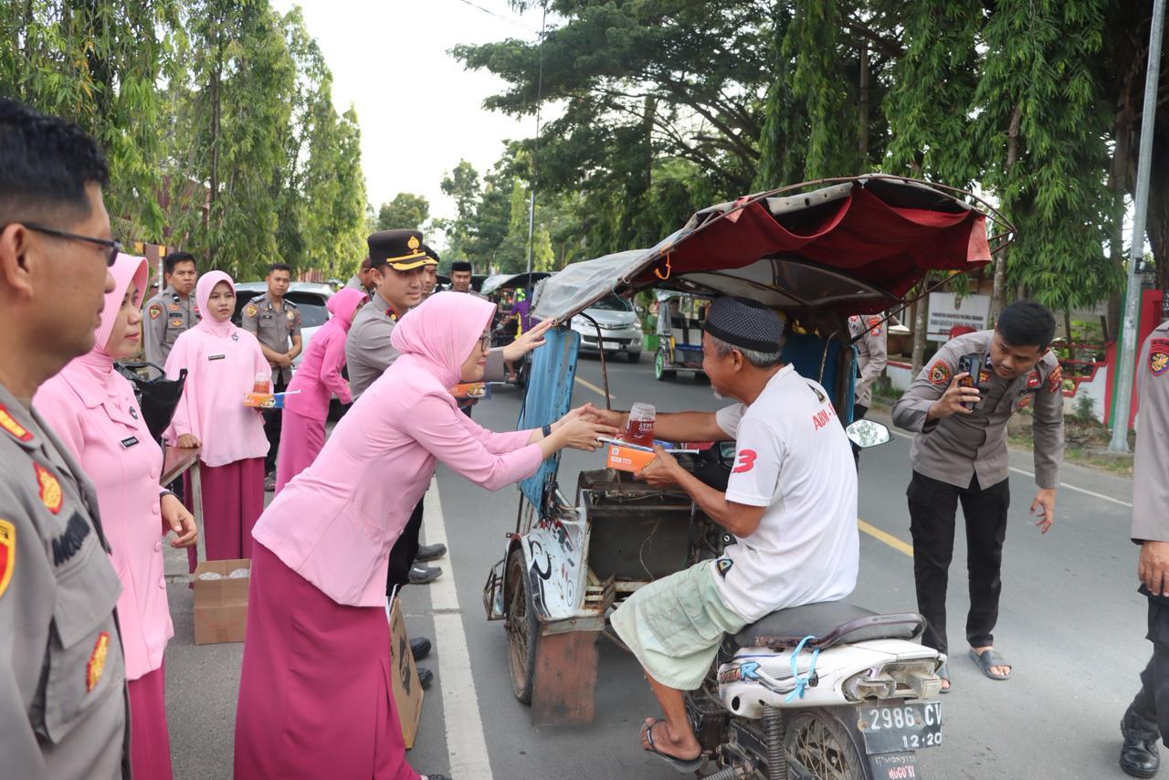 Pembagian takjil dilaksanakan secara serentak dengan menyasar para pengguna jalan yang melintas di sejumlah titik, termasuk di depan Mako Polres Polman.